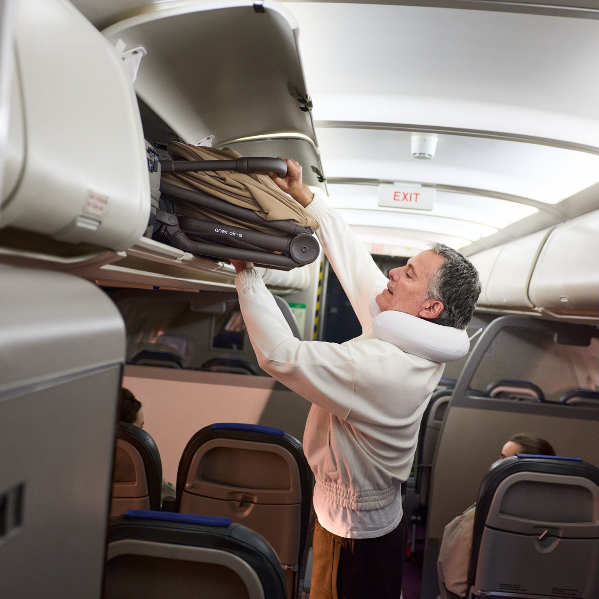 Anex Air-Q to lekki wózek dziecięcy ze składaną gondolą. Dzięki unikalnej konstrukcji, całość składa się wraz ze stelażem w jeden kompaktowy moduł, który bez trudu mieści się w lukach bagażowych samolotu.