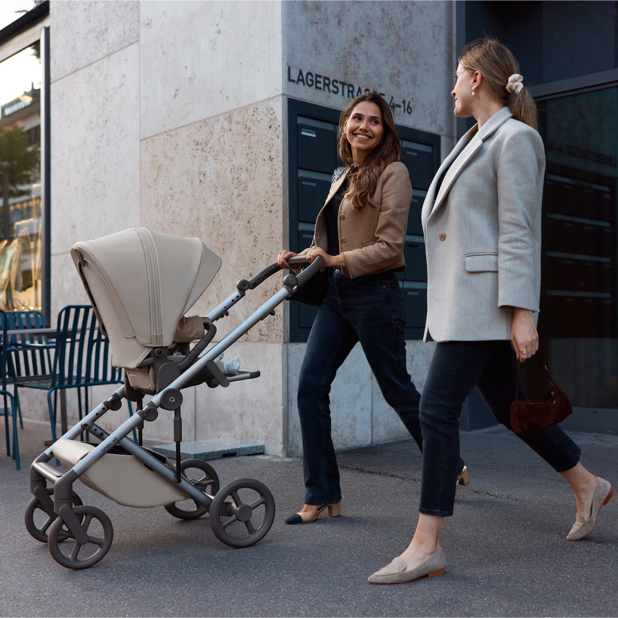 Gondola EPP z naturalnymi tkaninami i materacem Sorona tworzą bezpieczną i wygodną przestrzeń dla dziecka, podczas gdy koła z nową technologią bezobsługową zapewniają zawsze płynną jazdę.