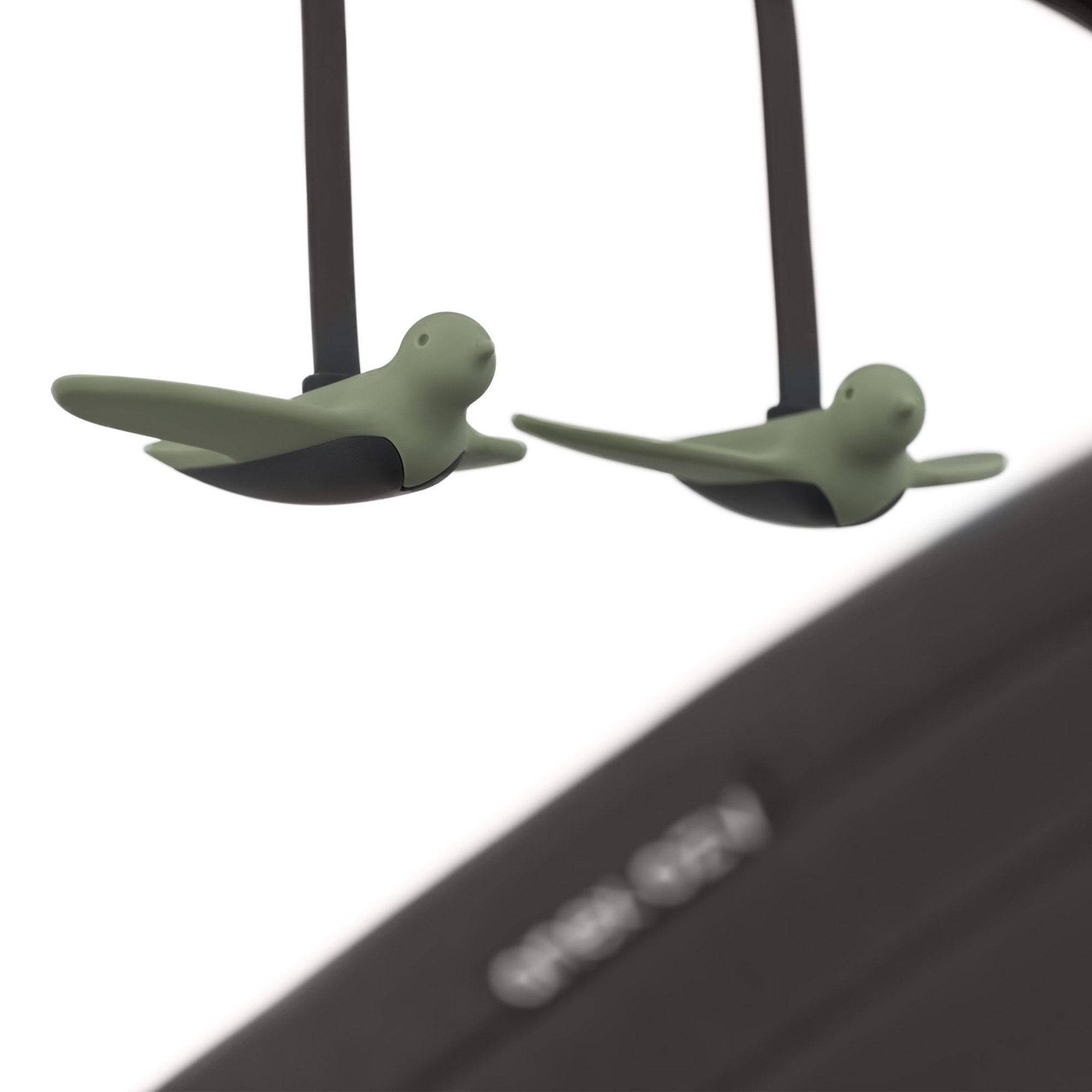 - siedzisko dla noworodków (0–6 mies.) – z miękką ergonomiczną wkładką, regulacją kąta nachylenia i wysokości, zabawkami stymulującymi wzrok oraz trzypunktowym pasem bezpieczeństwa
