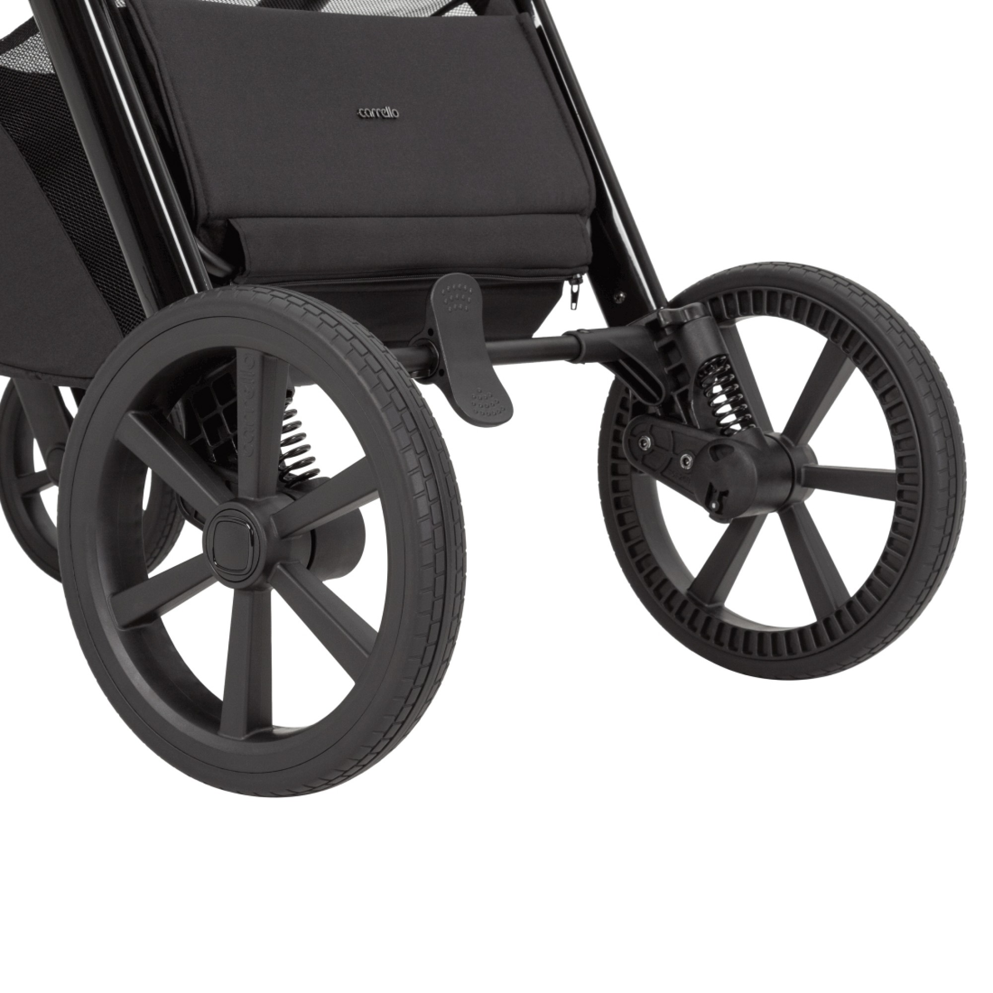 Podwozia w regulowaną dwustopniową amortyzację Przednie koła z automatyczną blokadą w pozycji "prosto", obracane o 360°. Wszystkie koła są szybkozłączne. Tylna oś podwozia jest wyposażona w regulowaną dwustopniową amortyzację. Amortyzacja przednich kół pochłania wibracje, gdy koło uderzy w dziurę lub przeszkodę.
