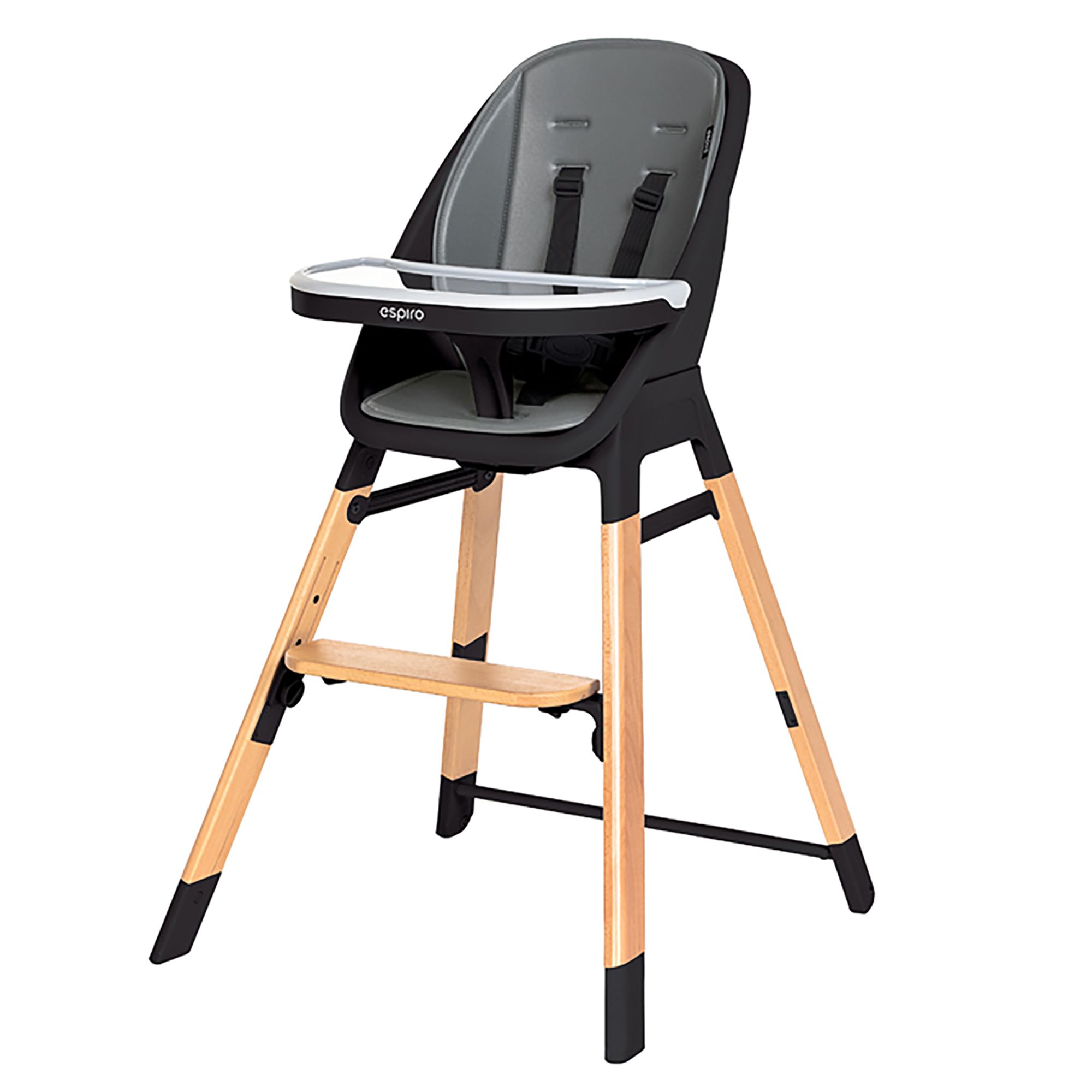 Espiro Sense to krzesełko do karmienia z 5-punktowymi pasami bezpieczeństwa. Stelaż mebla jest w większości wykonany z drewna bukowego, które ma bardzo wysoką klasę twardości, co wpływa na wytrzymałość i stabilność konstrukcji. Dodatkową zaletą jest mobilność mebla – tylne nogi Espiro Sense wyposażono w kółka, dlatego przesuwanie krzesła po podłodze nie wymaga wysiłku.