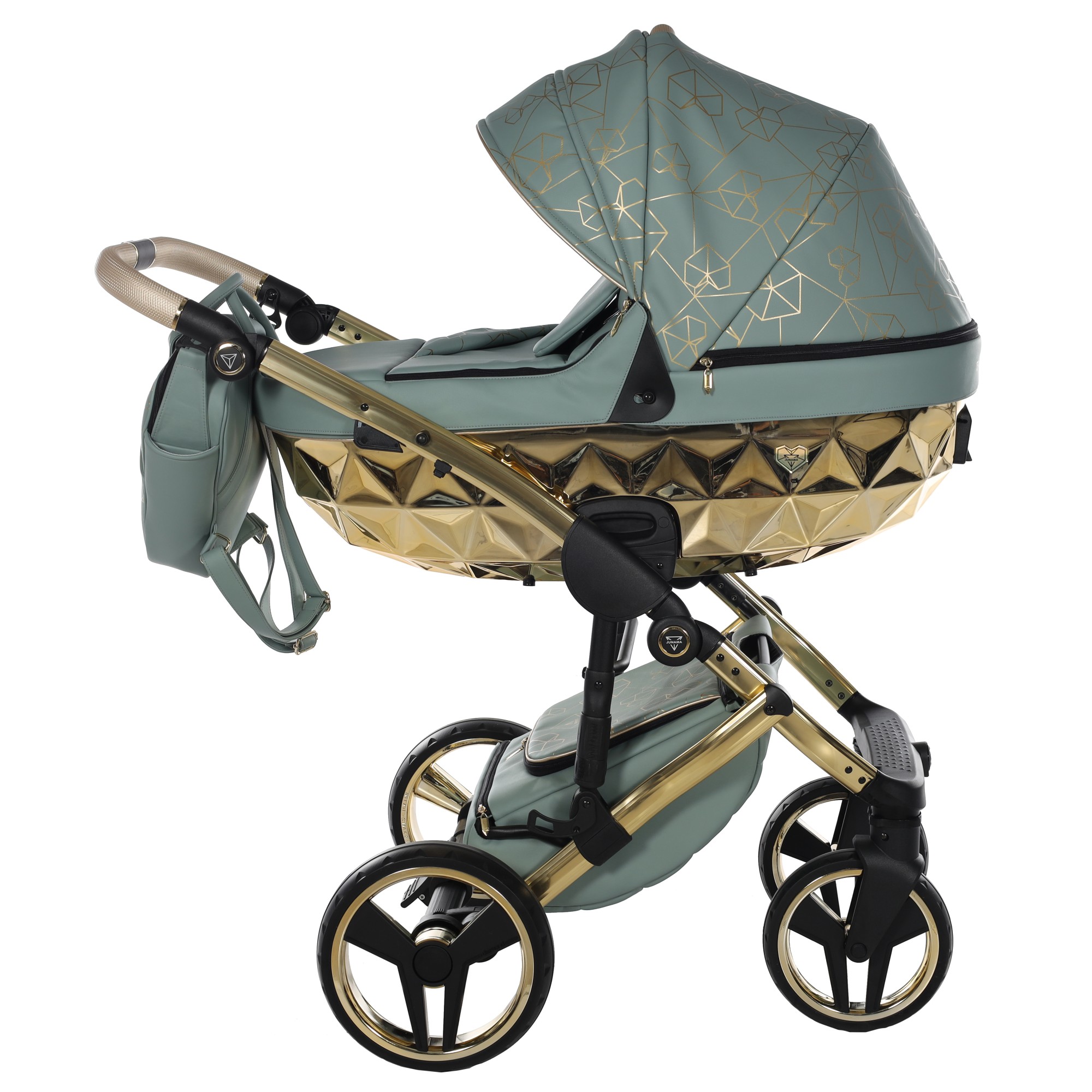 Model Heart to wielofunkcyjny luksusowy wózek dziecięcy o lustrzanym wykończeniu. Wózek został wykonany z eco skóry, a całość została umieszczona na lustrzano złotym stelażu. Montaż siedziska w dwóch kierunkach, dwupłaszczyznowy system amortyzacji przednich kół, regulacja wysokości rączki wykonanej z eko-skóry, innowacyjny system wentylacji i możliwość wpięcia fotelika samochodowego to nowy wózek dziecięcy marki Junama.