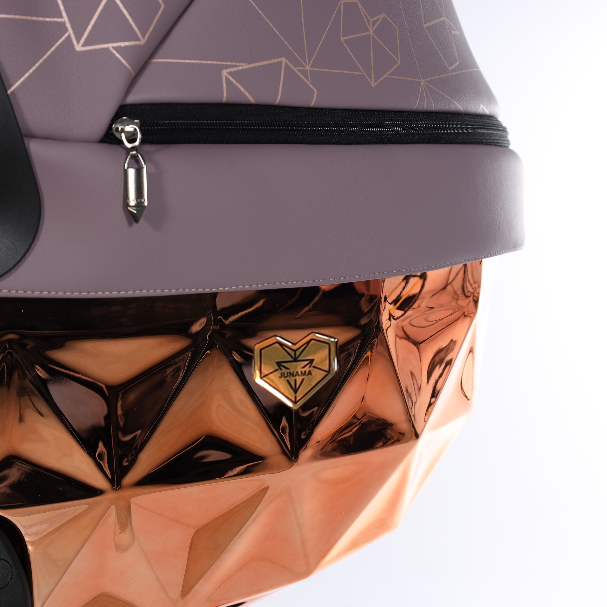 Model Heart to wielofunkcyjny luksusowy wózek dziecięcy o lustrzanym wykończeniu. Wózek został wykonany z eco skóry, a całość została umieszczona na lustrzano złotym stelażu. Montaż siedziska w dwóch kierunkach, dwupłaszczyznowy system amortyzacji przednich kół, regulacja wysokości rączki wykonanej z eko-skóry, innowacyjny system wentylacji i możliwość wpięcia fotelika samochodowego to nowy wózek dziecięcy marki Junama.