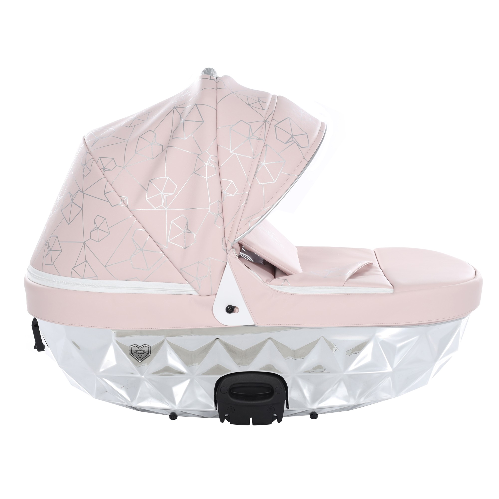 Lustrzana diamentowa gondola 3D Komfortowa duża i lustrzana diamentowa gondola 3D wózka jest znakiem charakterystycznym linii Diamond, a tapicerkę zdobi motyw w serduszka. Obok tego super modnego modelu wózka nie da przejść się obojętnie.