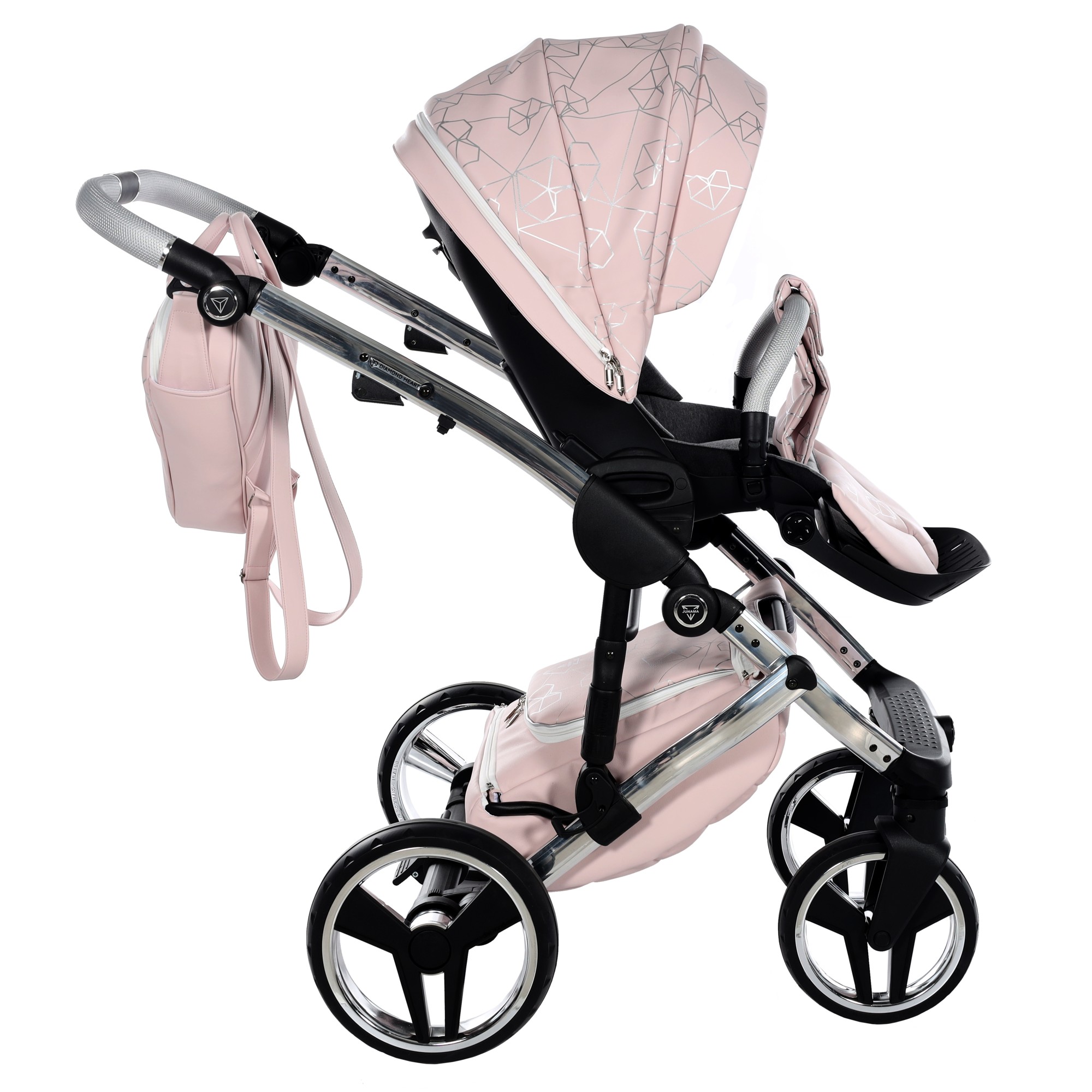 Model Heart to wielofunkcyjny luksusowy wózek dziecięcy o lustrzanym wykończeniu. Wózek został wykonany z eco skóry, a całość została umieszczona na lustrzano złotym stelażu. Montaż siedziska w dwóch kierunkach, dwupłaszczyznowy system amortyzacji przednich kół, regulacja wysokości rączki wykonanej z eko-skóry, innowacyjny system wentylacji i możliwość wpięcia fotelika samochodowego to nowy wózek dziecięcy marki Junama.
