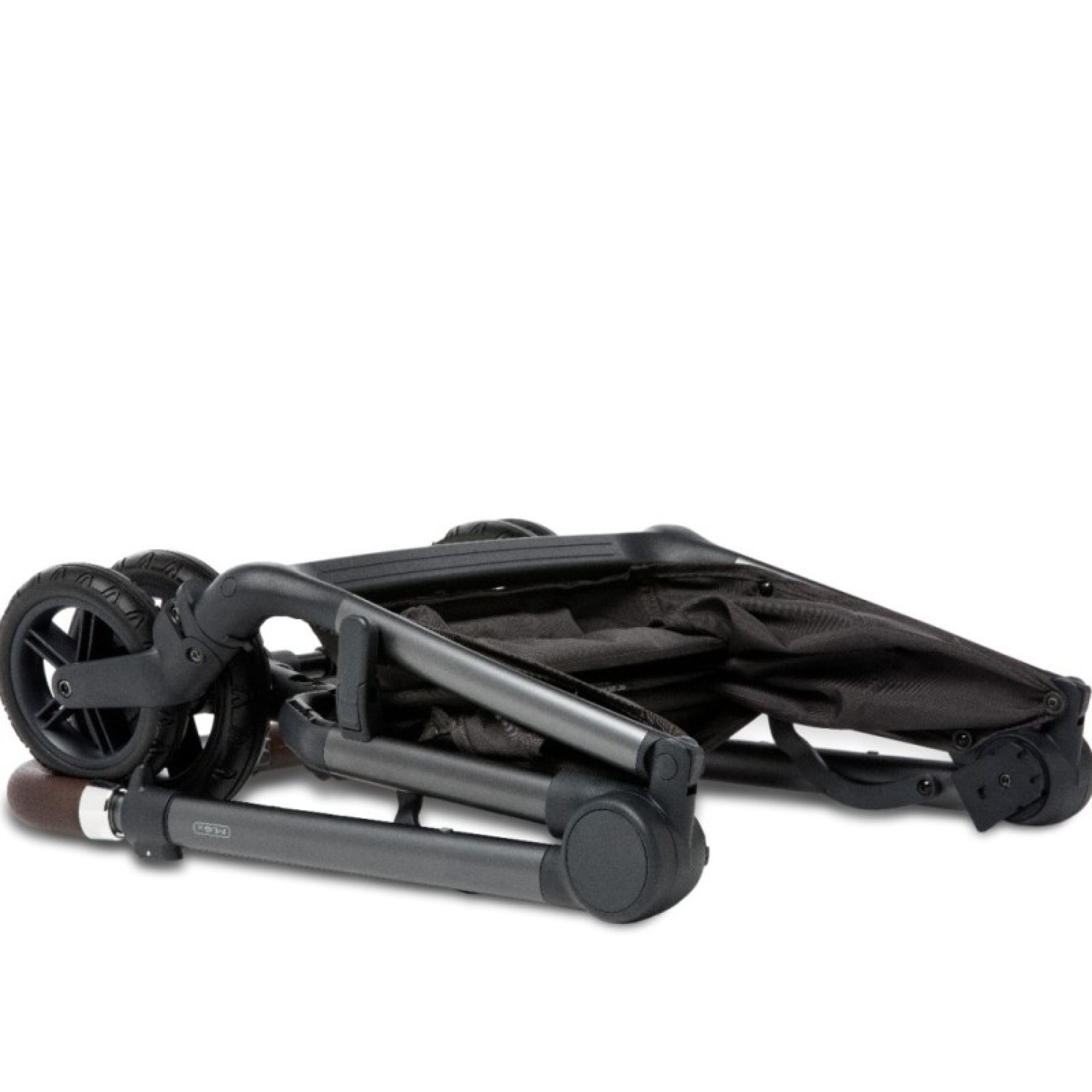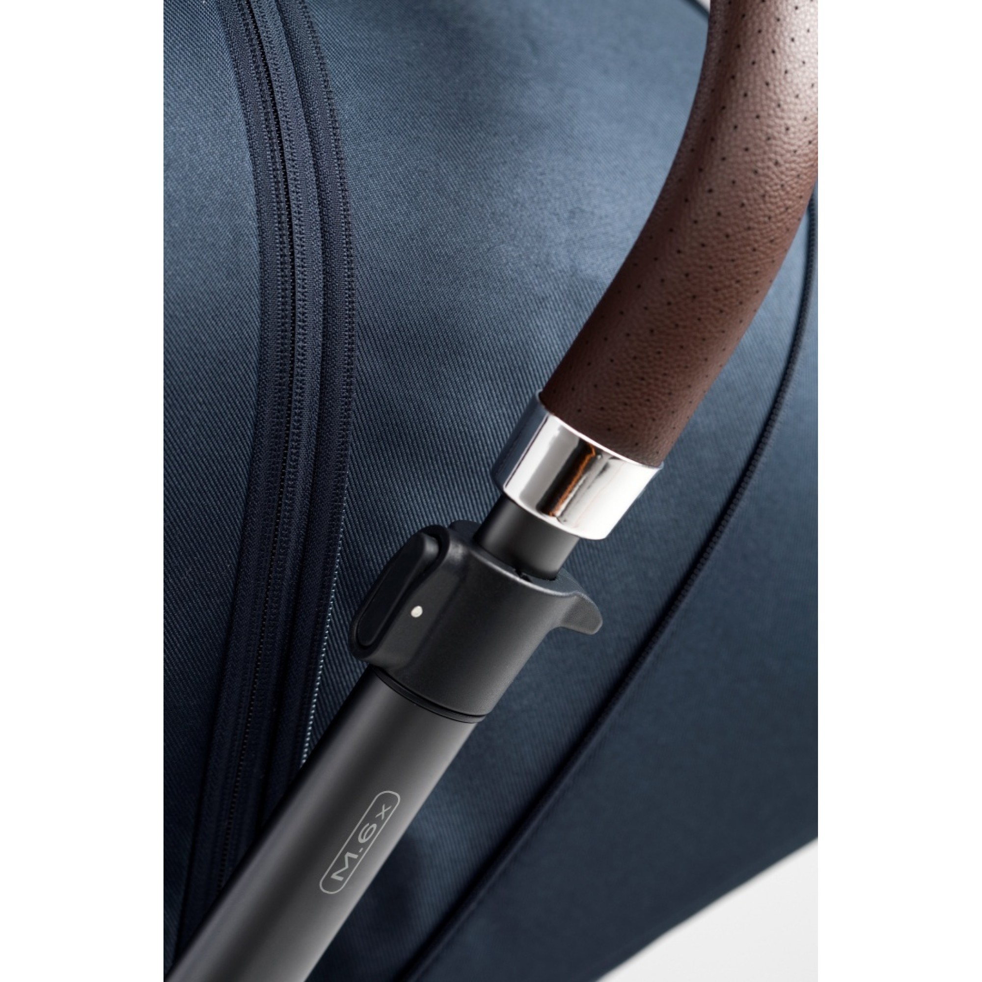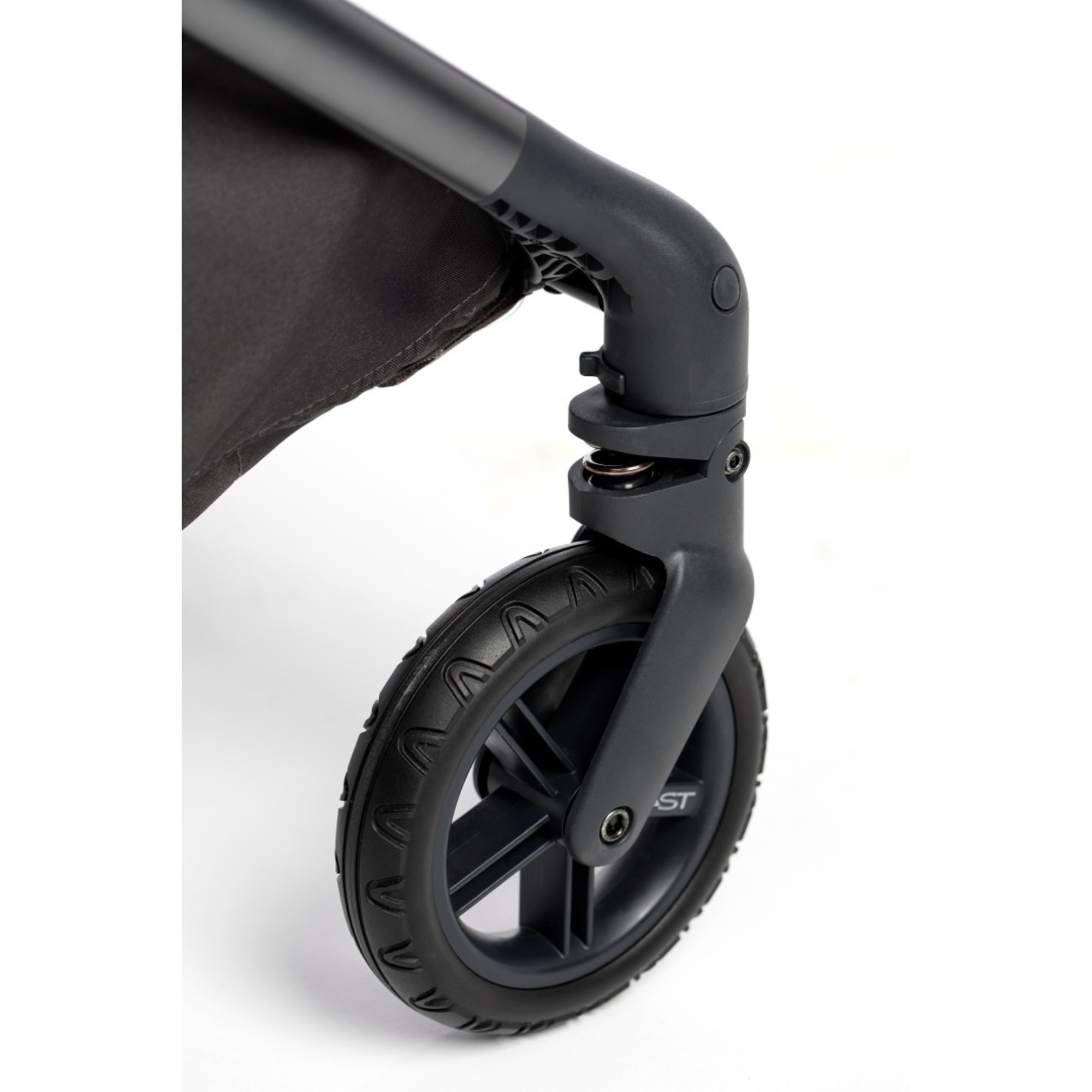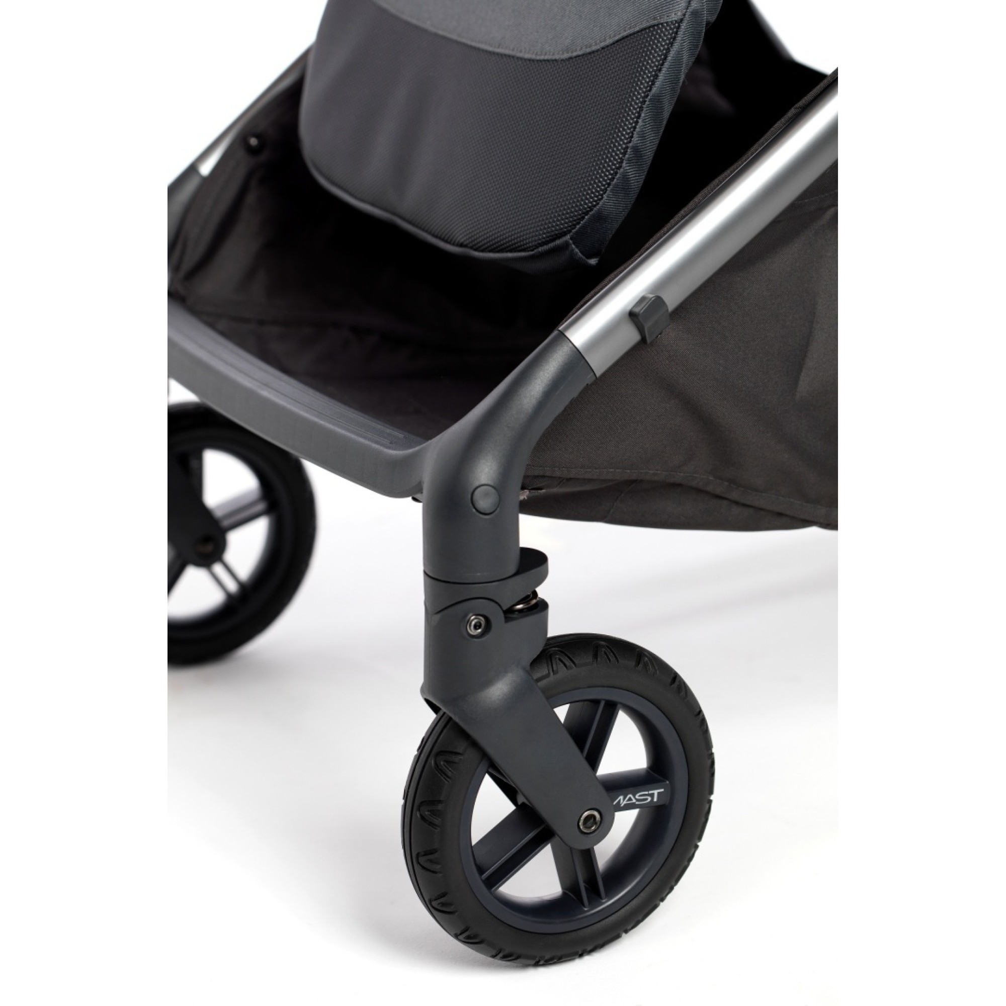 Wózek Mast M6x waży tylko 9,2 kg, składa się na płasko i ma anodowaną ramę odporną na zarysowania. Amortyzacja wszystkich kół oraz regulowana rączka teleskopowa zapewniają płynne prowadzenie. W zestawie znajduje się folia przeciwdeszczowa.