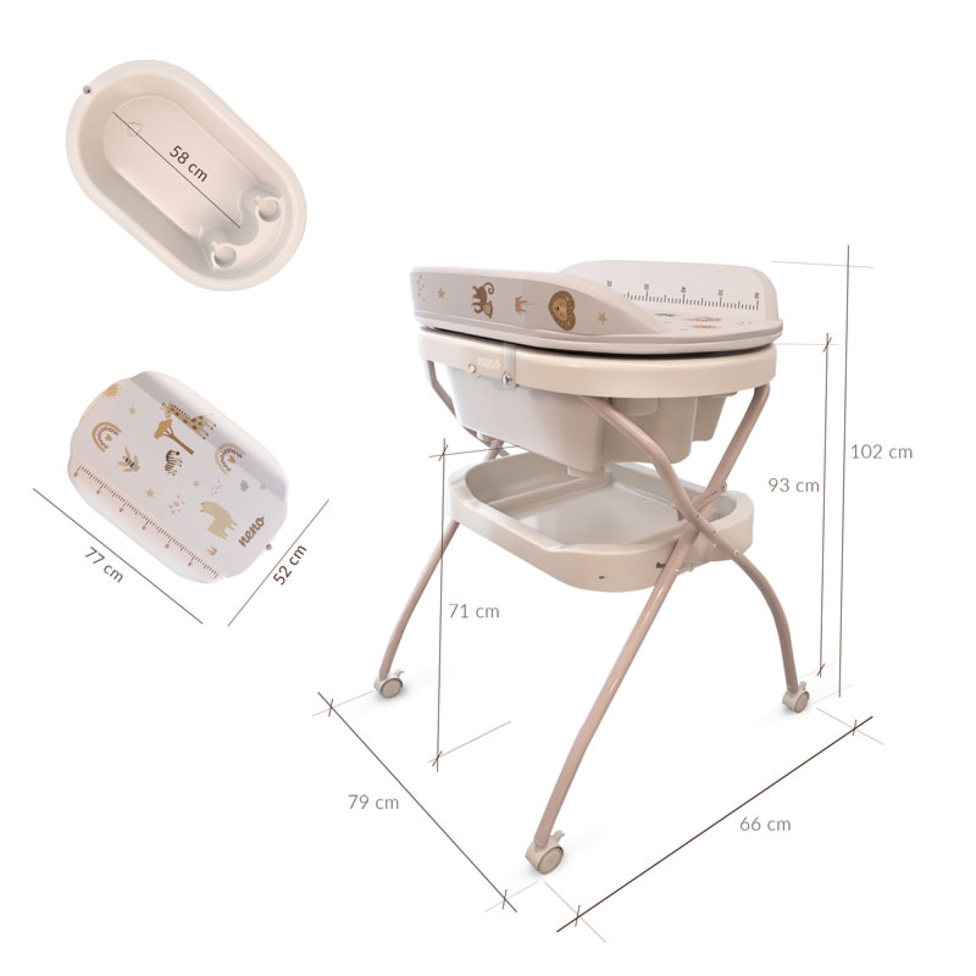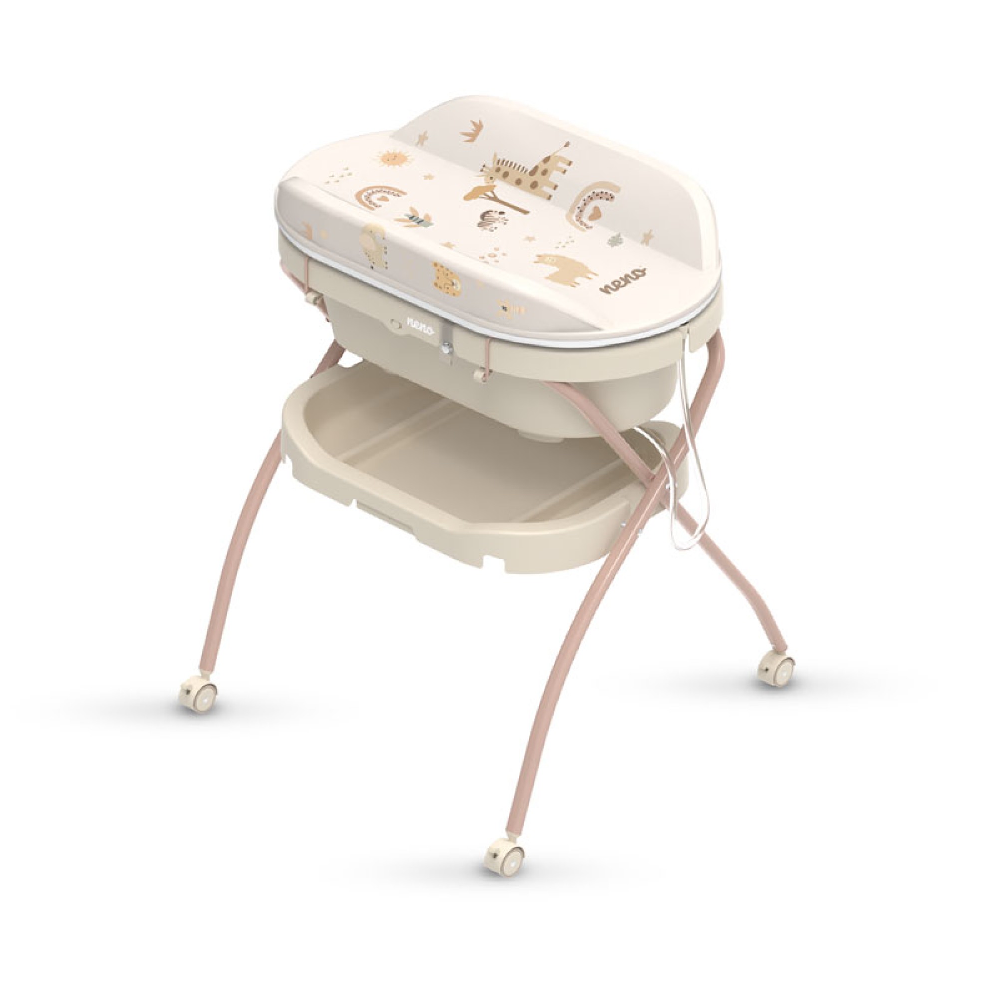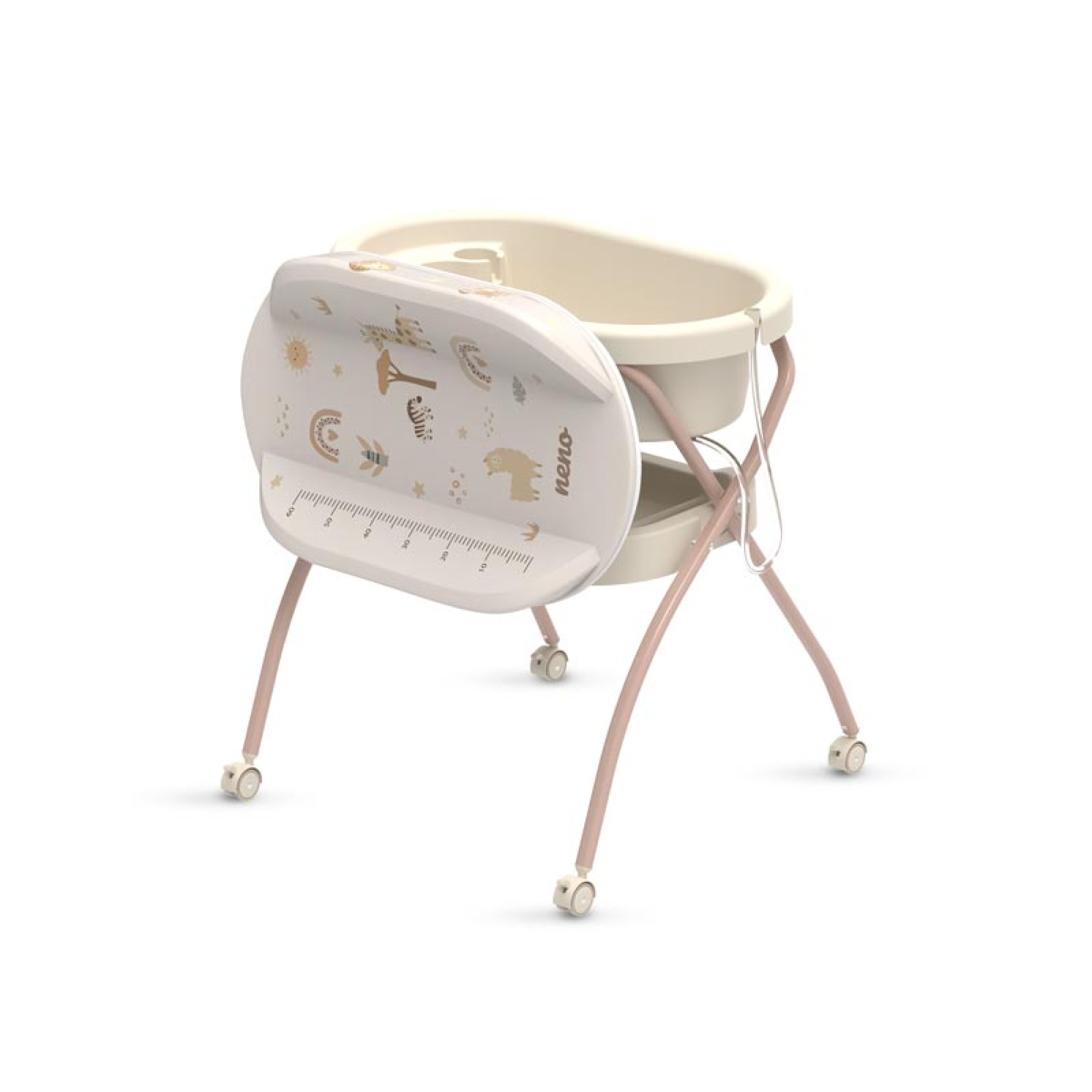 Neno Breza wyposażona w 4 kółka z blokadą, korek odpływowy z rurką oraz praktyczną półkę na akcesoria. Przewijak posiada miarkę i boczne ścianki, które zwiększają bezpieczeństwo dziecka.