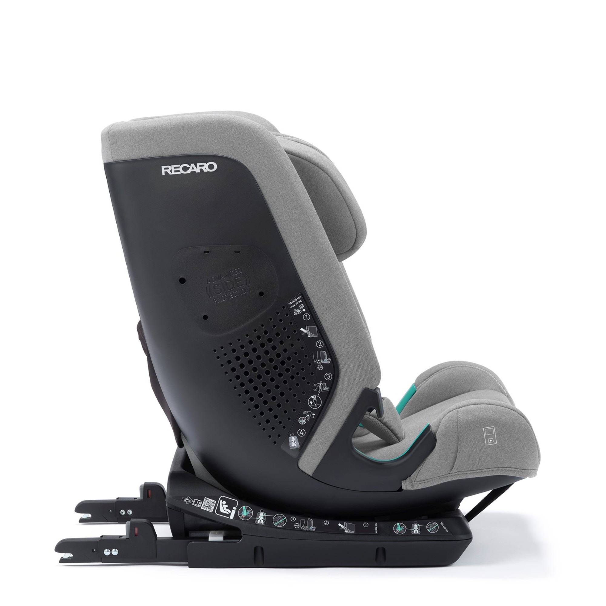 Intuicyjna instalacja ISOFIX w połączeniu z Top Tetherem, zapewniają nie tylko łatwą obsługę, ale również spełniają rygorystyczne normy homologacji i-Size. Trzy punkty zakotwiczenia utrzymują fotelik w odpowiedniej pozycji i rozkładają energię działającą na dziecko w przypadku kolizji. Raz zainstalowany fotelik może pozostać w samochodzie nieruszany, nawet w przypadku rozbudowania pod starsze dziecko (100 - 150 cm).