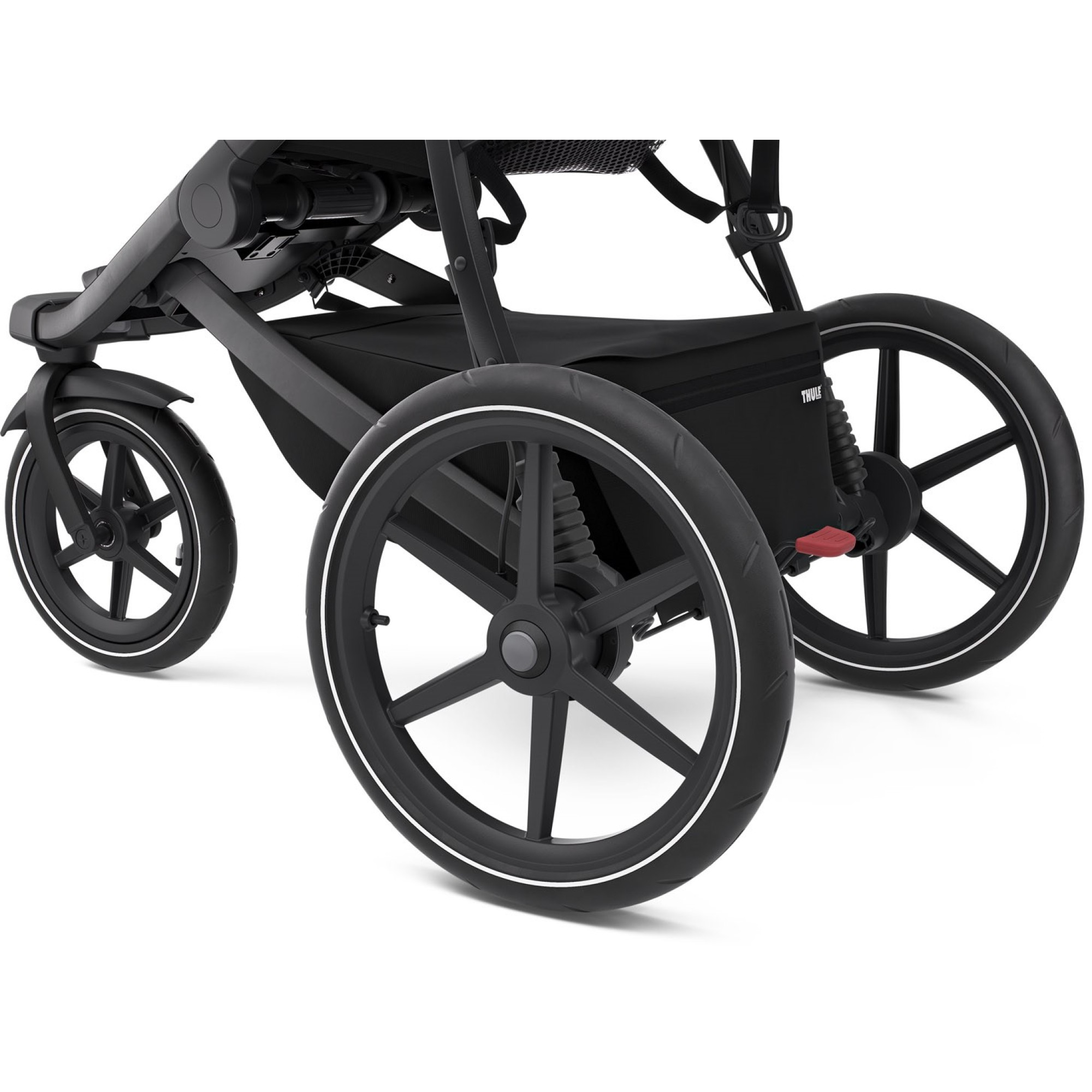 Amortyzowane tylne koła Duże 40-centymetrowe koła tylne, które gwarantują stabilność podczas biegania. Zawieszenie zapewnia płynną jazdę rodzicowi i dziecku. Z wózkiem Thule Urban Glide 2 nie musisz rezygnować z joggingu. Większe koła i zawieszenie klasy premium zapewnią Twojemu dziecku maksimum komfortu.