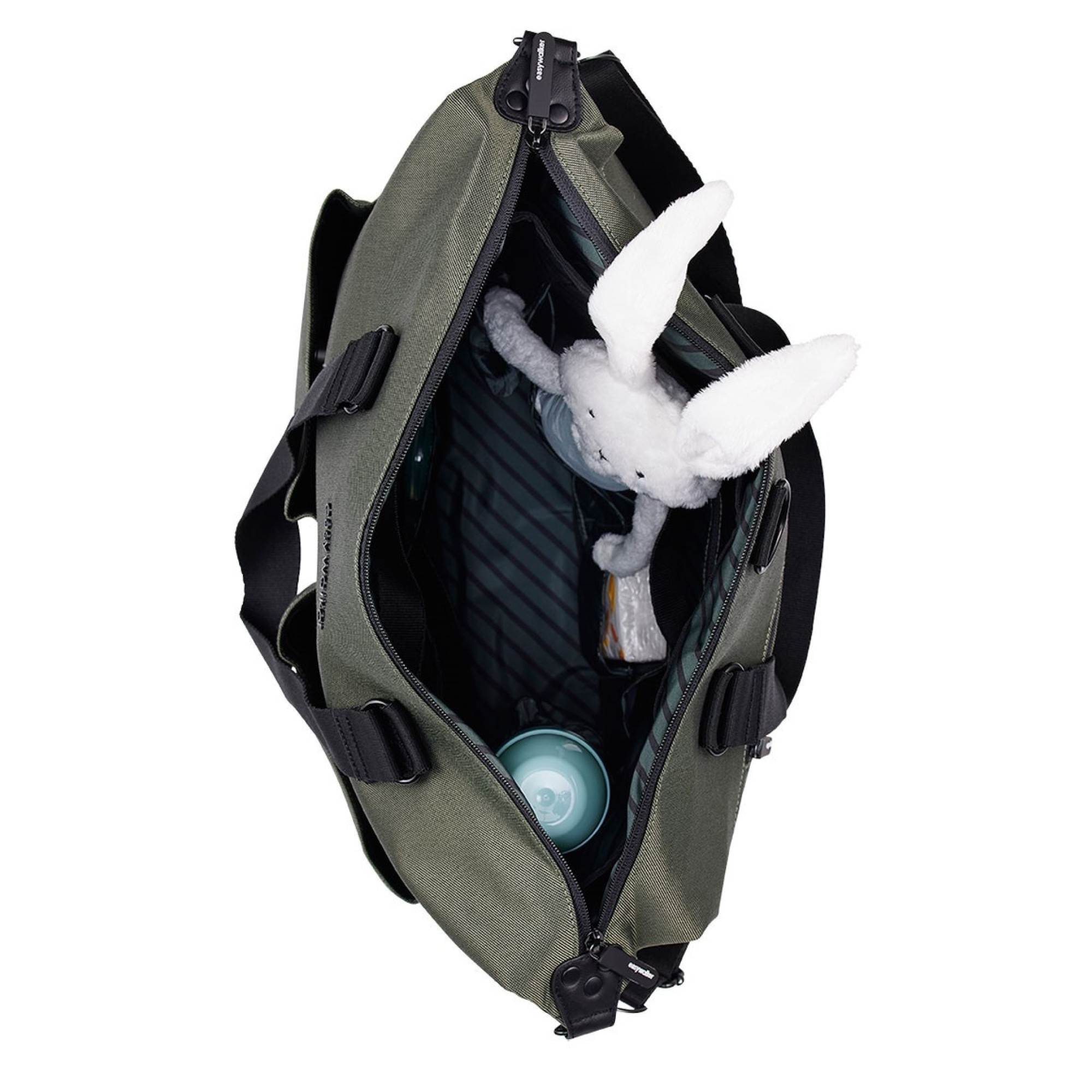 Komora główna jest zapinana na suwak, wewnątrz niej znajduje się kilka kieszonek, w tym dwie z gumowanymi brzegami, ułatwiającymi utrzymanie pionie butelek z mlekiem lub napojami. Z łatwością posegregujesz w niej pieluszki, chusteczki, ubranka i inne artykuły pierwszej potrzeby.