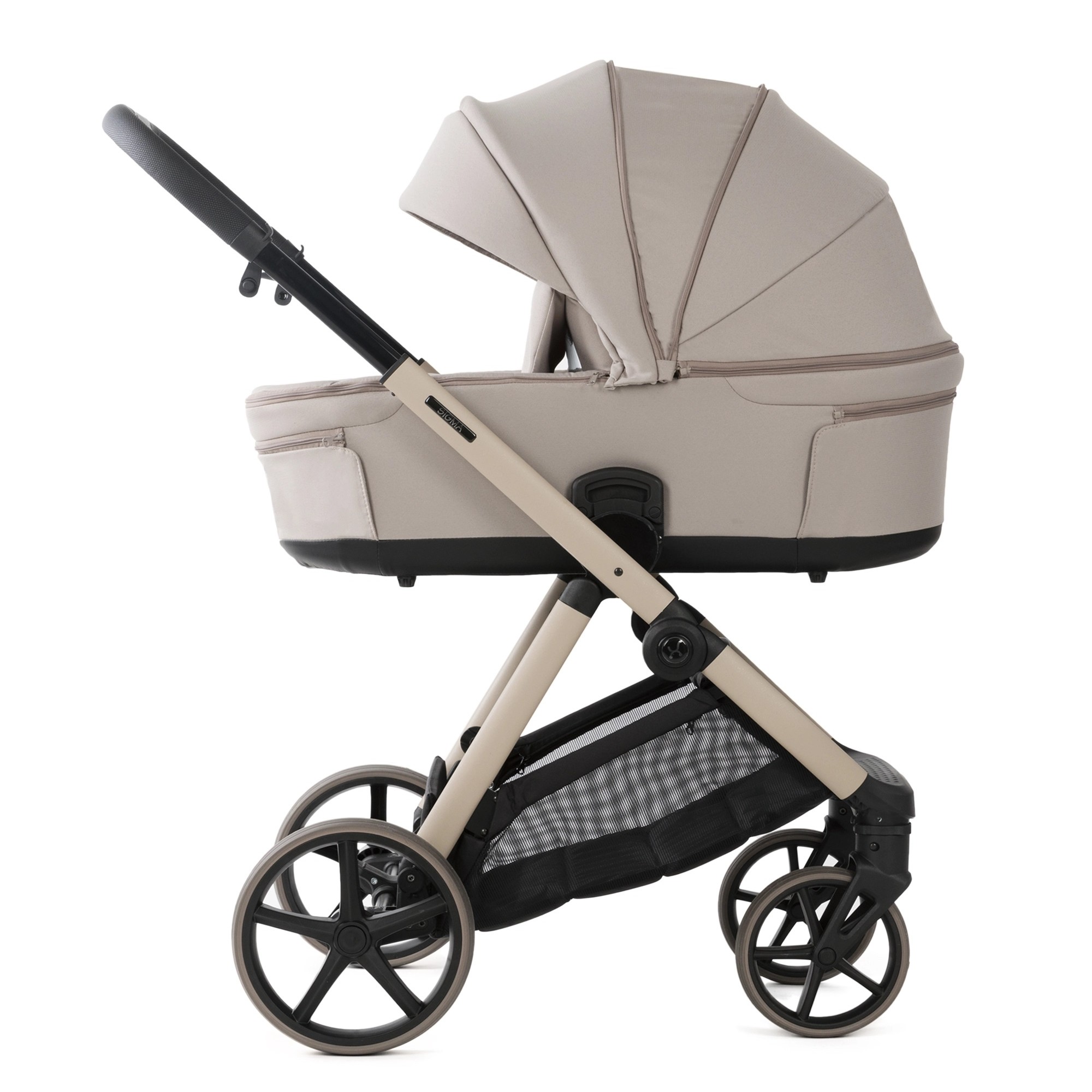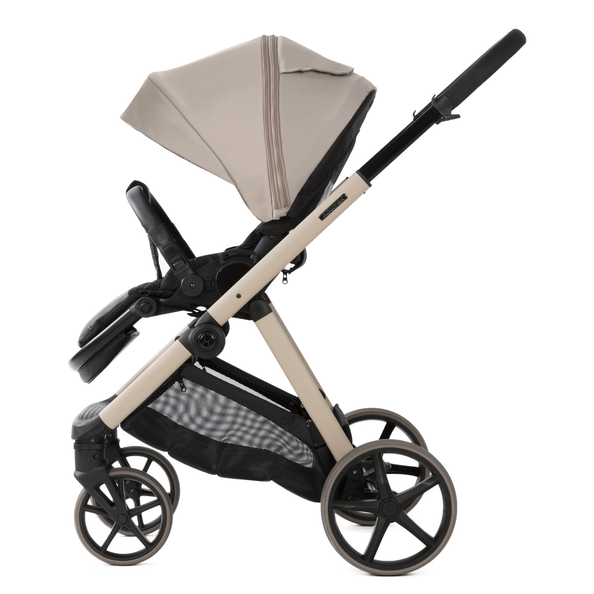 Комплектація коляски Adamex Sigma Natura: люлька з чохлом, прогулянкове сидіння з чохлом на ніжки, сонцезахисна бленда, елегантна сумка для мами, ремінь для сумки, дощовик, універсальна москітна сітка, підстаканник.