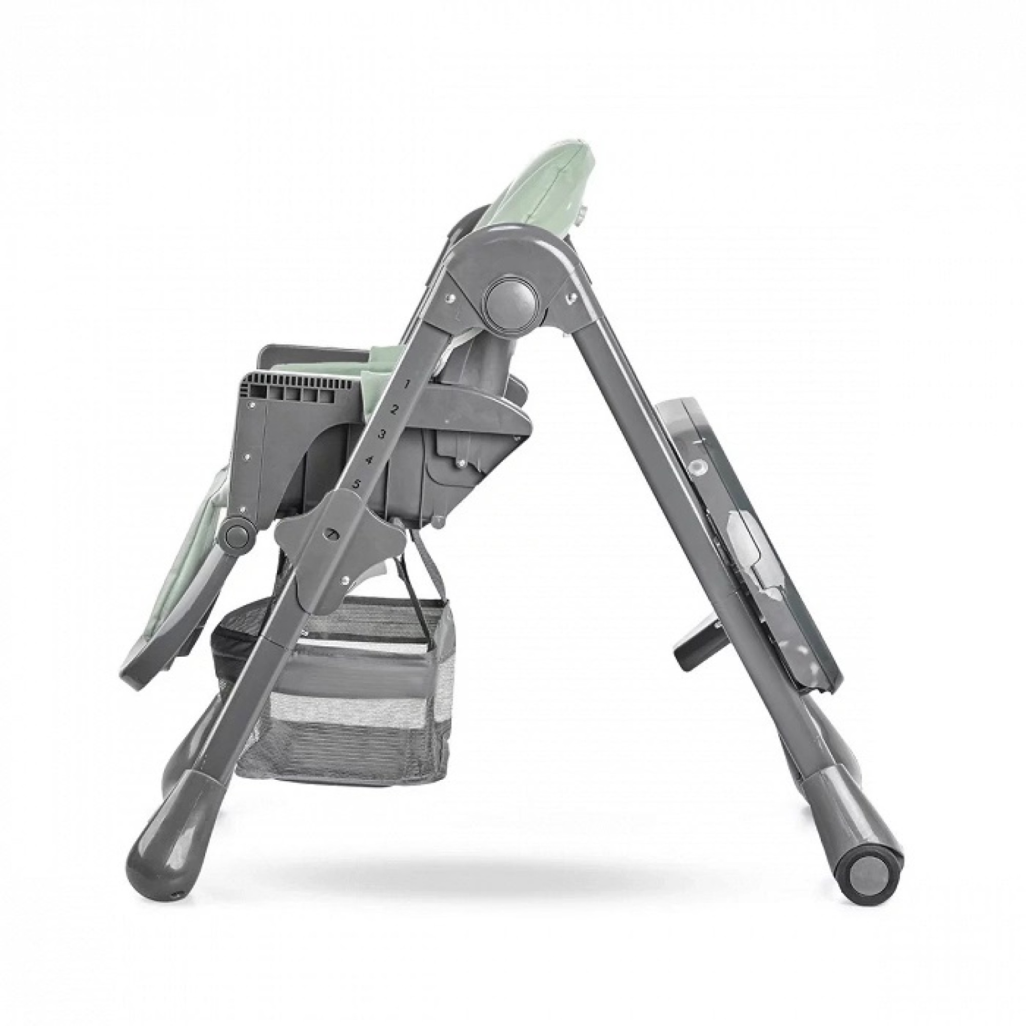 Регульована підставка для ніг і піднос Лоток із двох частин можна мити під проточною водою - розмістіть його на одній із 3 відстаней від дитини. Практичний кошик під сидінням, в якому можна сховати вологі серветки, серветку або нагрудник. А для маленьких дітей є додаткова підставка для ніг.