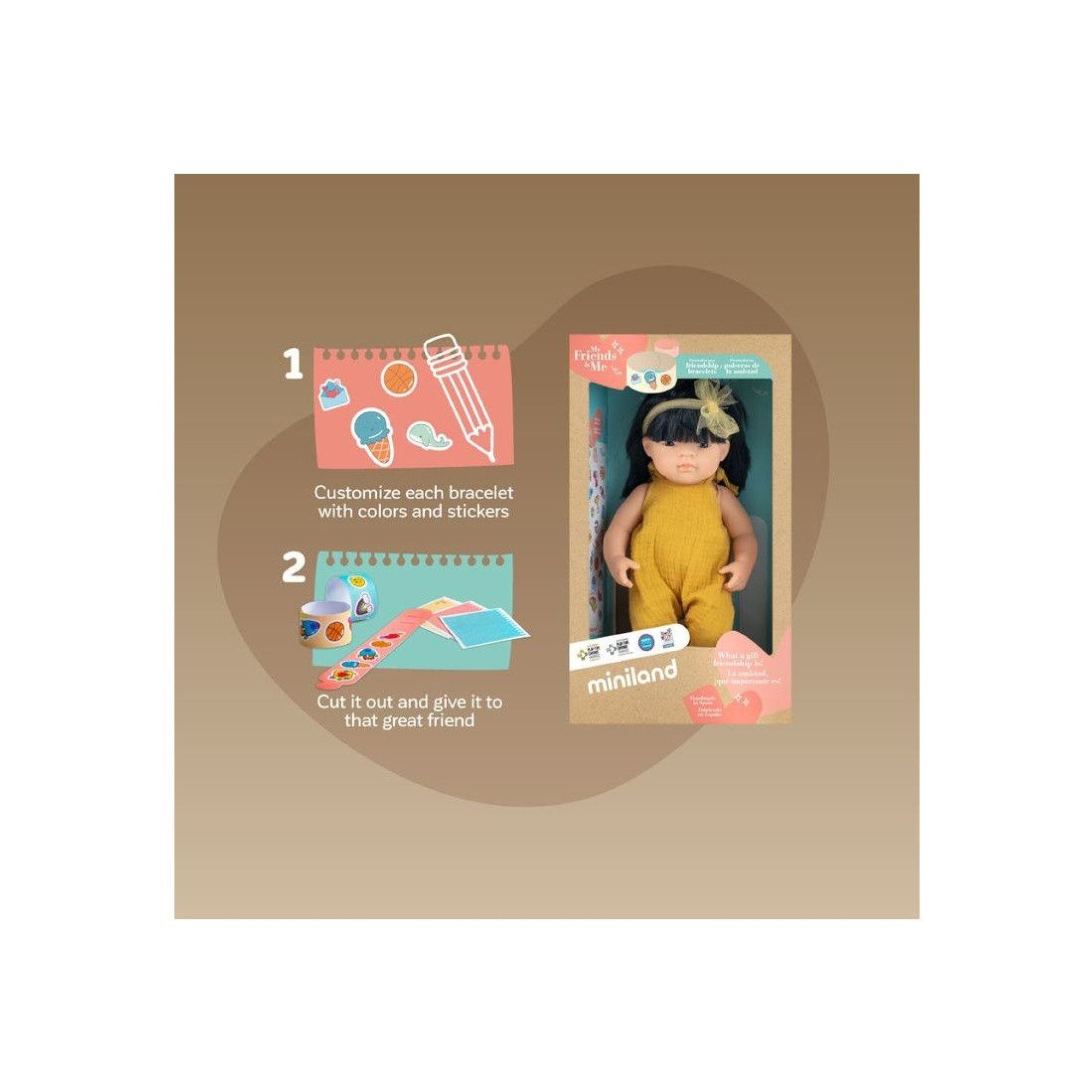 Lalka dziewczynka Azjatka o wysokości 38 cm z kolekcji „My Friends & Me” firmy Miniland. Ta urocza lalka promuje wartości przyjaźni, dzielenia się oraz akceptacji różnorodności.