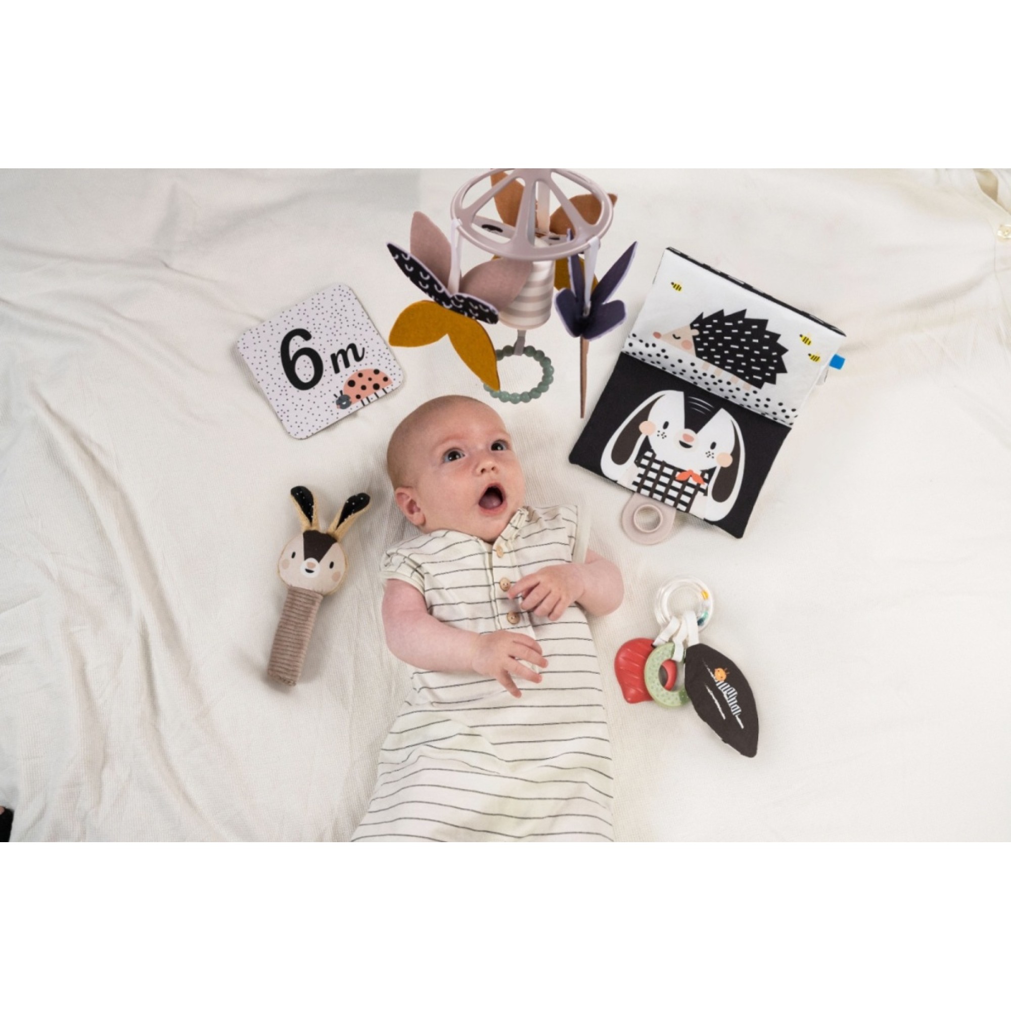 - Rozwój sensoryczny: czarno-biała książeczka, grzechotka, dzwoniąca zawieszka i szeleszczące elementy stymulują wzrok, słuch i dotyk – zgodnie z etapami rozwoju dziecka.