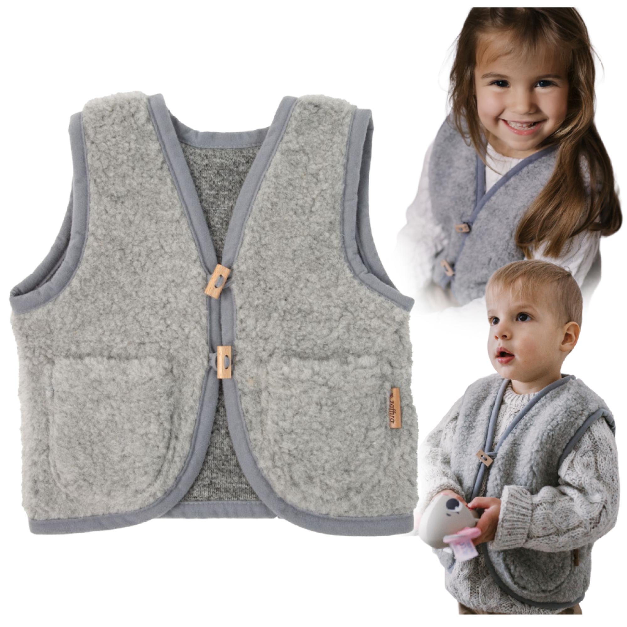 Kamizelka Nevada z naturalnej wełny. O uniwersalnym kroju, pasuje zarówno chłopcom i dziewczynkom.Wełniana kamizelka dziecięca - ciepło, wygoda i naturalne materiały – wszystko, co najlepsze dla Twojego malucha.